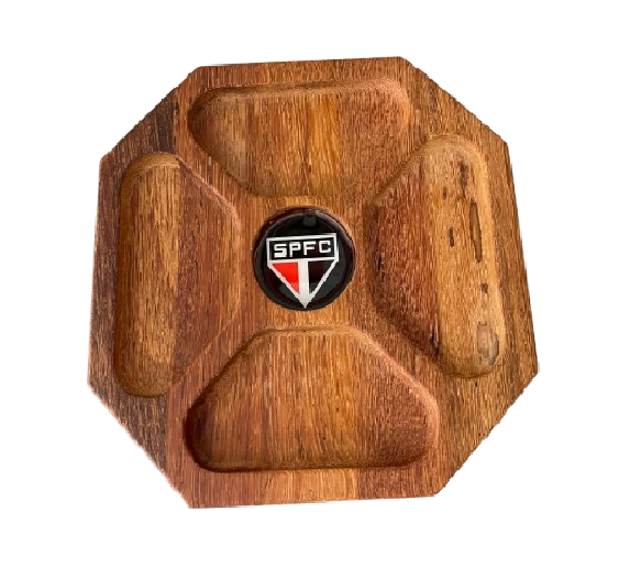 Leve a paixão pelo Tricolor para sua mesa com uma petisqueira em madeira maciça, produzida de forma artesanal, com a logo do São Paulo FC em destaque. Perfeita para servir com estilo em encontros, jogos e momentos especiais.